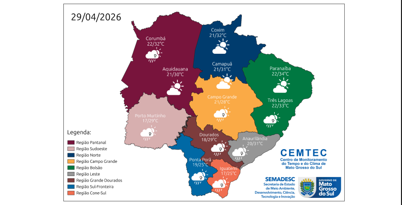 O clima mais fresco que animou muitos sul-mato-grossenses na última segunda-feira (27) se despede definitivamente do Estado nesta quarta-feira (29). Segundo a meteorologia, as temperaturas voltarão a subir, podendo chegar a 34°C em alguns municípios.