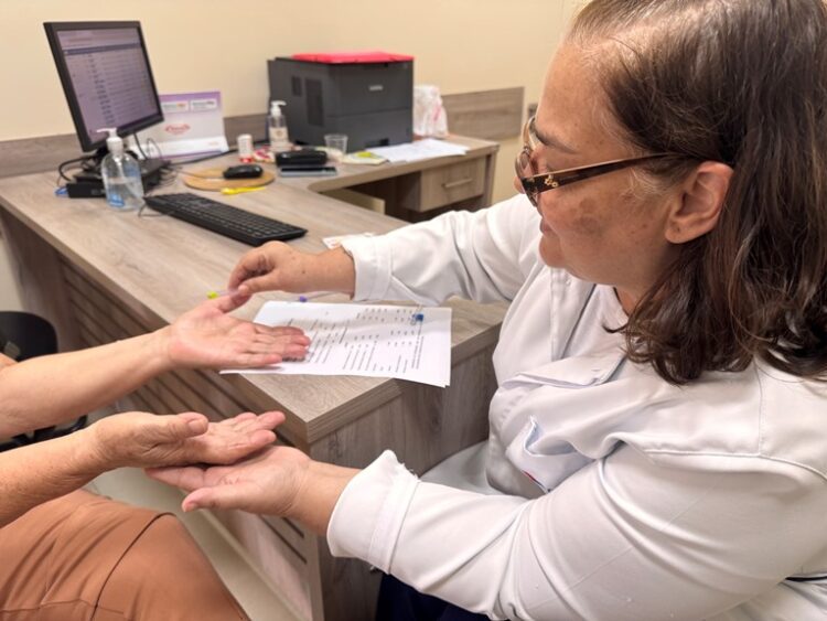 Utilizando um monofilamento, um pequeno fio de nylon indolor que testa os pontos de pressão, a enfermeira Simone consegue detectar precocemente qualquer alteração. O teste é rápido, simples e fundamental para quem busca longevidade com segurança. “Esse monitoramento melhora muito a qualidade de vida. Com o estesiômetro, avaliamos a sensibilidade a cada seis meses e conseguimos detectar precocemente se o paciente está descompensado ou se há alguma lesão”, explica Simone. Segundo ela, esse olhar atento da enfermagem é decisivo: “Isso diminui muito as internações e até mesmo as amputações. Na consulta, também orientamos sobre autocuidado e como ativar a circulação, fortalecendo a autonomia do paciente”.