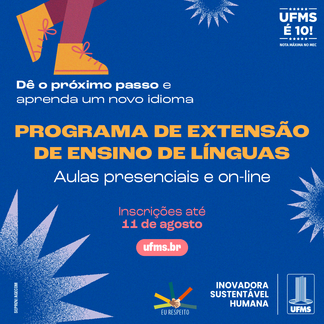 Mais informações em: https://www.ufms.br/ cursos-de-idiomas-do-programa- de-extensao-de-ensino-de- linguas-oferecem-mais-de-800- vagas/