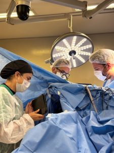 A medical professional in scrubs and a mask holds a tablet, focused on a surgical procedure under bright lights.