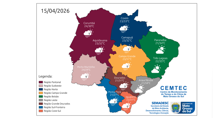 Segundo o Cemtec (Centro de Monitoramento do Tempo e do Clima), há possibilidade de aumento de nuvens e ocorrência de chuvas, que podem vir acompanhadas de tempestades, descargas elétricas e rajadas de vento.