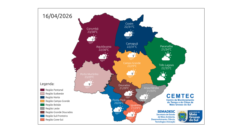 A meteorologia não descarta a ocorrência de chuvas e tempestades em Mato Grosso do Sul nesta quinta-feira (16). Essa instabilidade é favorecida pela atuação de um centro de baixa pressão atmosférica que tem origem no nordeste da Argentina.